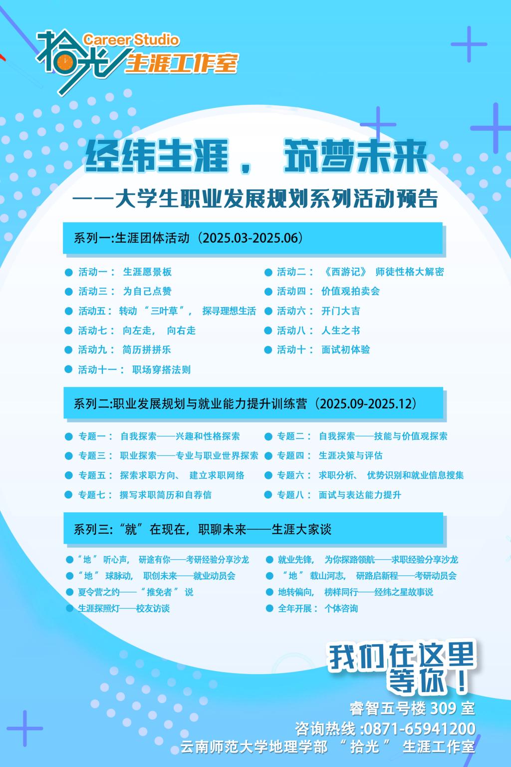 为帮助同学们明确职业方向、提升综合竞争力,地理学部“拾光”生涯工作室将于2025年3月起,启动“经纬生涯,筑梦未来”系列职业发展活动。活动涵盖生涯探索、能力训练、经验交流三大板块,助力每一位同学在大学生涯中找准方向、稳步前行。具体活动预告如下: